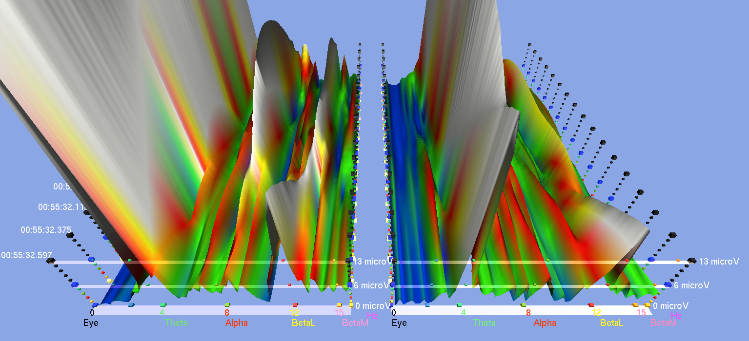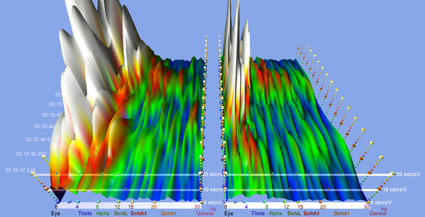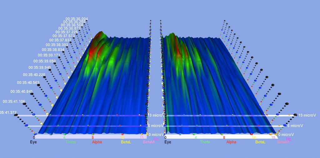 Here are some screenshots from various EEG studies that I did with subjects receiving the sound meditation in which I use harmonic overtones-producing instruments to a clearly audible level. Basically, it shows to what extent the brain activities (the peaks in different colors) in both hemispheres diminish or even flatten when certain harmonic overtones-emitting instruments are played, and the level of synchrony and coherence that resulted in both hemispheres. Notice the numbers on the bottom in both hemispheres. These are the brainwave cycles measured in Herz (Hz. cycles per second).