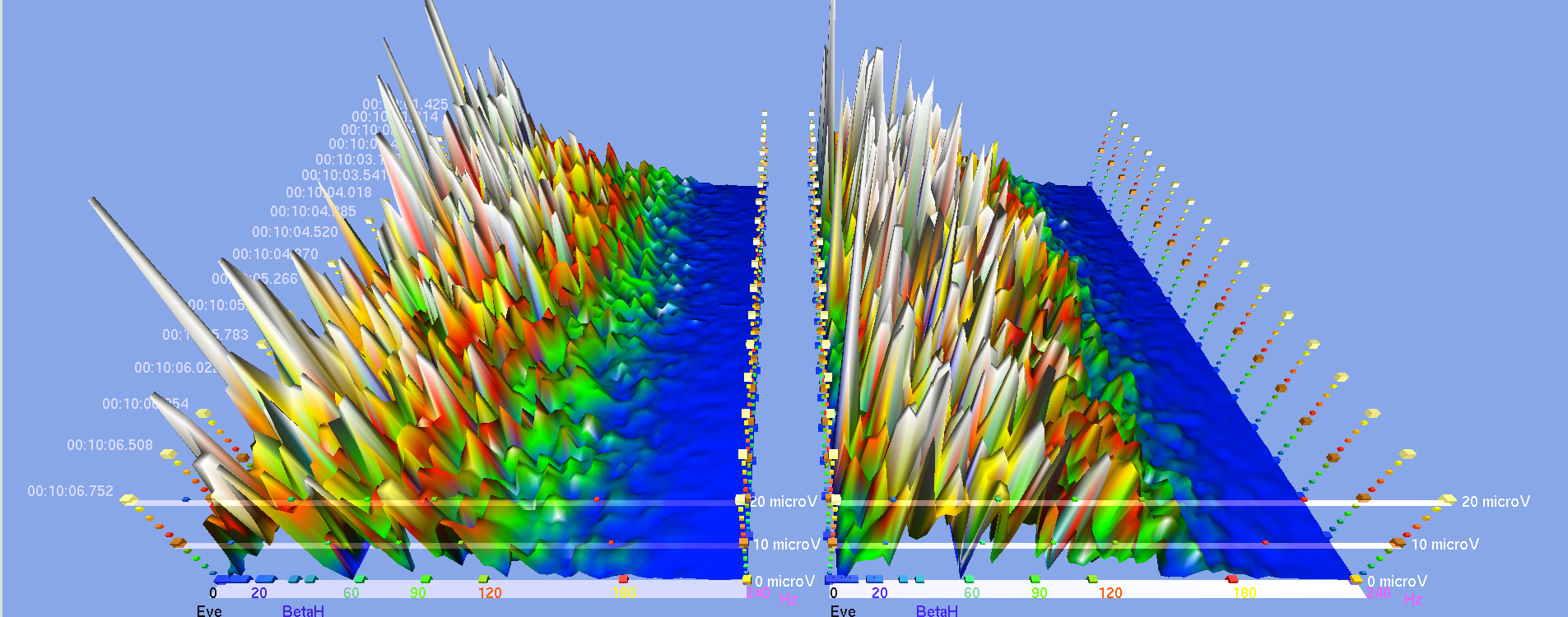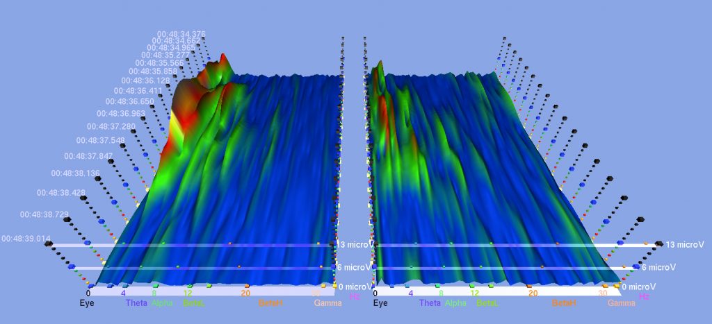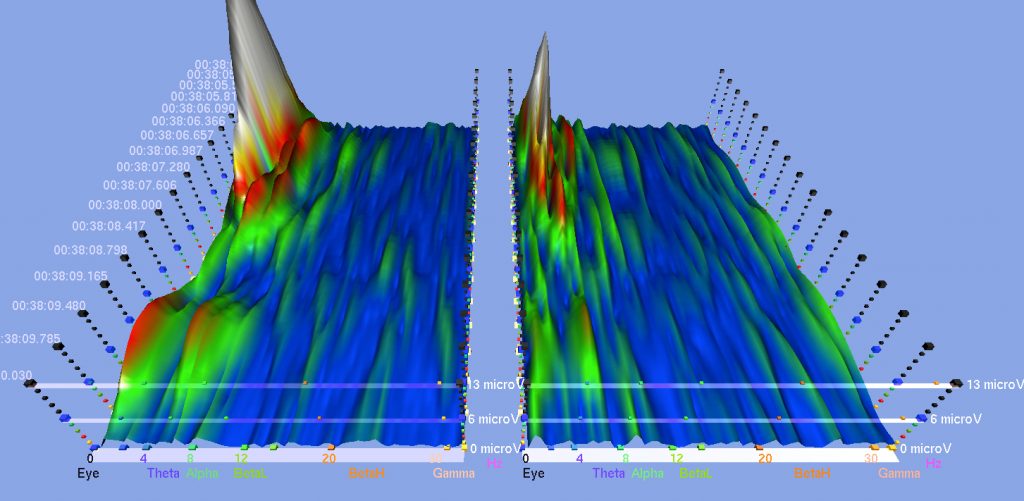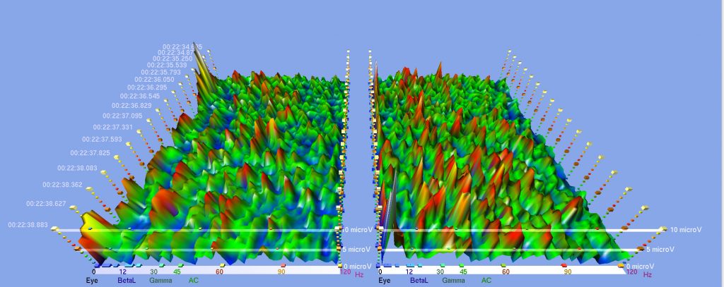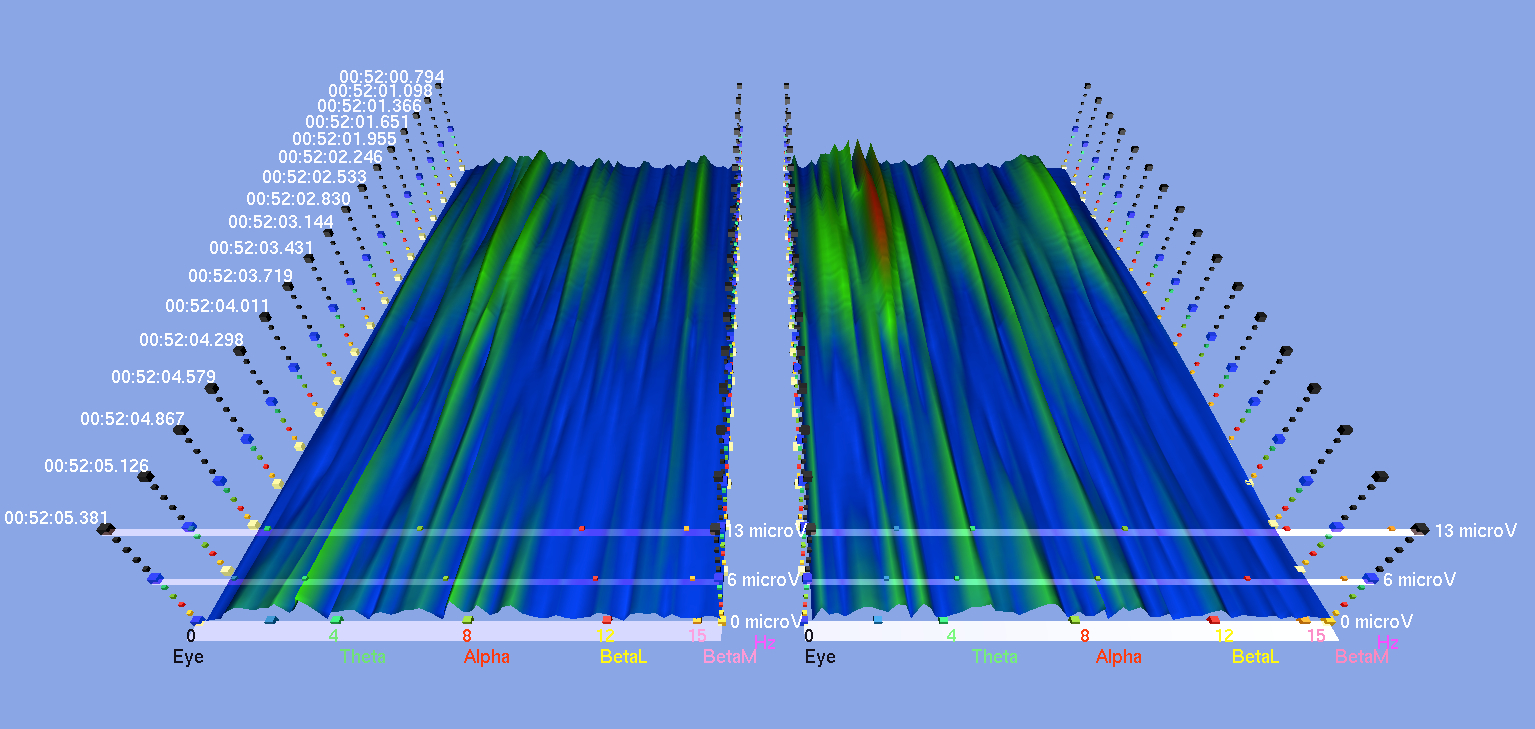 Here are some screenshots from various EEG studies that I did with subjects receiving the sound meditation in which I use harmonic overtones-producing instruments to a clearly audible level. Basically, it shows to what extent the brain activities (the peaks in different colors) in both hemispheres diminish or even flatten when certain harmonic overtones-emitting instruments are played, and the level of synchrony and coherence that resulted in both hemispheres. Notice the numbers on the bottom in both hemispheres. These are the brainwave cycles measured in Herz (Hz. cycles per second).